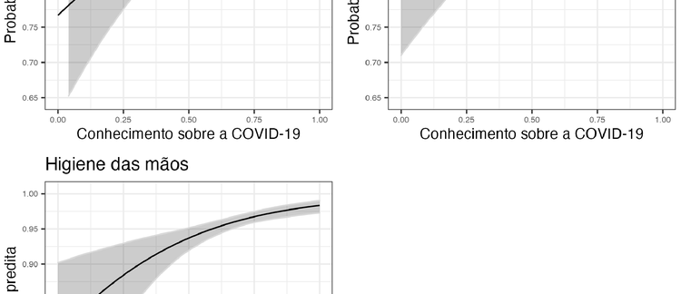 Como a interpretação dos coeficientes de regressão logística não é direta, a associação entre conhecimento e adoção de comportamentos preventivos é retratada na Figura 2. A figura apresenta a probabilidade prevista de concordar com as três medidas preventivas não farmacológicas contra a COVID-19, por nível de conhecimento da COVID-19. Para as três medidas preventivas, a associação é positiva, o que significa que a concordância aumenta com o maior conhecimento sobre a COVID-19. Os menos informados são significativamente menos propensos a concordar com o uso de máscaras faciais, distanciamento social e lavagem das mãos. A diferença em relação às máscaras faciais, por exemplo, é particularmente grande. A probabilidade prevista de os menos informados concordarem com as máscaras faciais é de 0,77, em comparação com 0,96 entre os mais informados, uma diferença de 0,19 (estatisticamente significativa ao nível 6). Este é um efeito muito grande dado que a maioria dos brasileiros concorda com as medidas preventivas e, portanto, não há muita variação amostral a ser explicada.