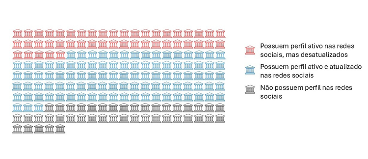 Entretanto, embora os guias e a busca feita em nossa pesquisa tenham identificado a prevalência de perfis dos CMCT brasileiros nas redes sociais, é também relevante que em muitas instituições tais ações pareceram estar sem manutenção ou descontinuadas. Como apontado anteriormente, 143 CMT possuem perfil nas plataformas de redes sociais, porém, considerando o Facebook®, apenas 45 que mantinham perfis, o tinham desatualizado há pelo menos 12 meses. Nas outras redes (Instagram®, Youtube®, Twitter®, Flickr®), 30 dos 143 CMCT não atualizavam com frequência. Trabalhos recentes produzidos pelo grupo do Instituto Nacional de Comunicação Pública da Ciência e Tecnologia vinculado ao COC/FioCruz também indicaram certa descontinuidade e dispersão nas atividades dos museus nas redes sociais [Ribeiro et al., 2022].