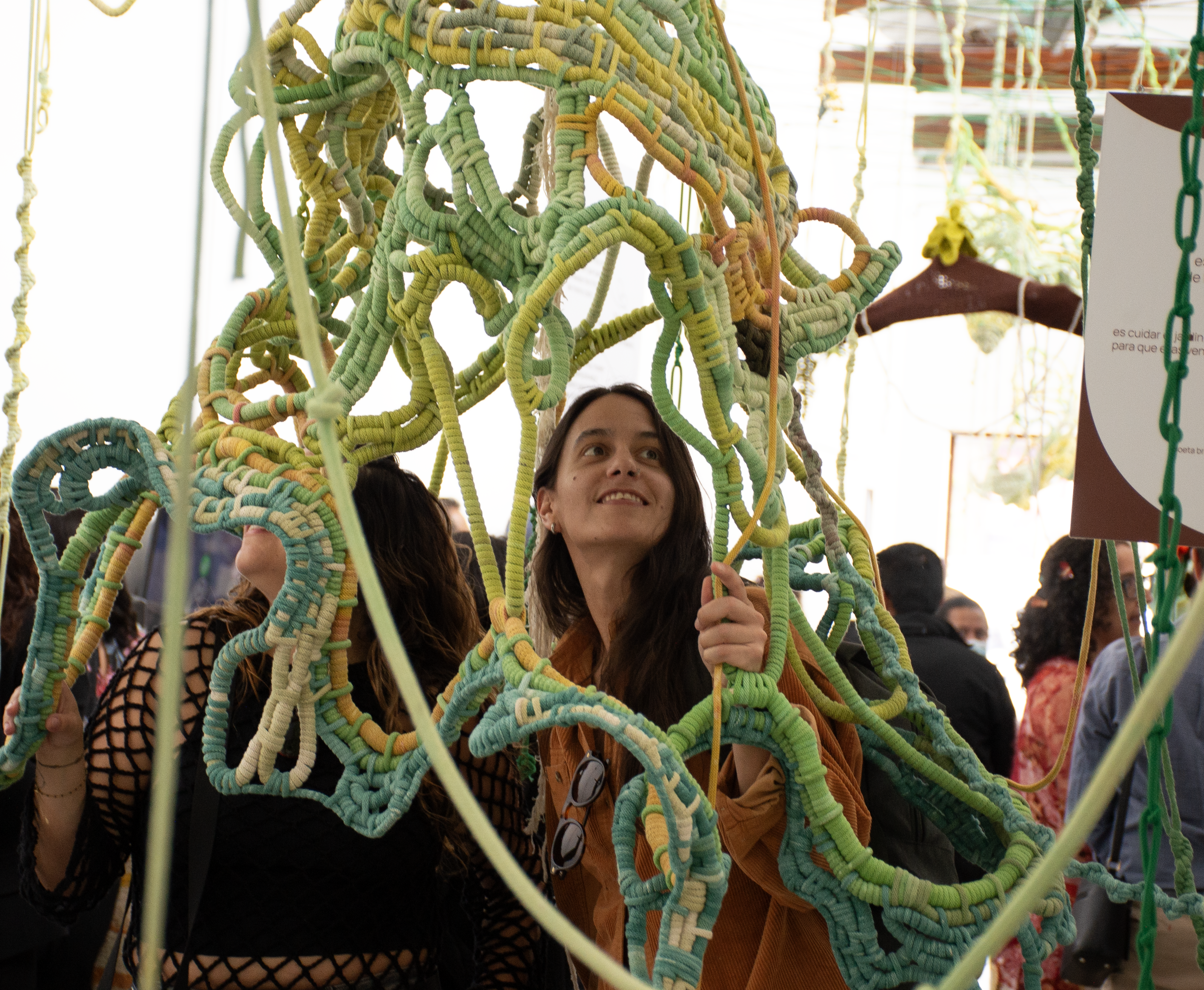 En la zona final, “Maripensario” presentó una red textil en deterioro como metáfora del daño ambiental causado por la acción humana, pero también funcionó como una invitación a reparar y reconfigurar activamente el tejido del ecosistema. El público estaba convocado a intervenir en esta red, incorporándose al tejido, y dejando sus reflexiones personales, reforzando la noción de corresponsabilidad y agencia transformadora (Figura 7).